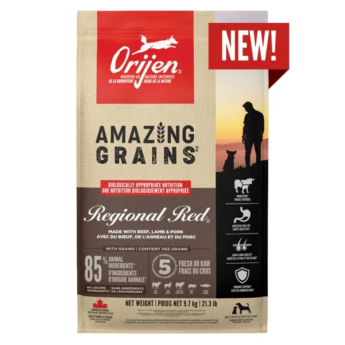 ORIJEN Amazing Grains Regional Red Dry Dog Food delivers peak nutrition inspired by nature. Crafted with 85% animal ingredients including beef, lamb, beef liver, pork, and salmon, it provides your dog with a rich source of protein, vitamins, and minerals that mirror the diet of their wild ancestors. The addition of DHA and EPA from wild-caught pollock oil supports brain function, immune health, and a glossy coat.